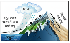 কারণসমূহ:আর্দ্রবায়ু পর্বতের ঢাল বেয়ে ওপরে উঠলে ঠাণ্ডা হয়ে ঘনীভূত হয় এবং বৃষ্টিপাত ঘটায়।
